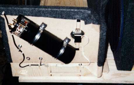 Nu paste de poorten er wel in en moest de kist aan de binnenkant bekleed worden, want dan isoleert de kist beter en bij de lokale audiozaak zeiden ze dat ik afzuigkapwol kon gebruiken, dus heb ik deze erin geniet. Intussen had ik al bedacht om de versterkers in de planken gaan te bouwen en af te werken met zwarte biezen, maar ik moest nog wel bij de achterlichten kunnen dus moesten de zijplanken gaan schanieren, dit werd gedaan met behulp van pianoscharnieren. Terwijl ik rond aan het lopen was bij de hobbyzaak zag ik ineens een setje halogeen lampen liggen en voelde me toch genoodzaakt om een setje te kopen, want mijn originele kofferbak lamp die zag je niet meer.